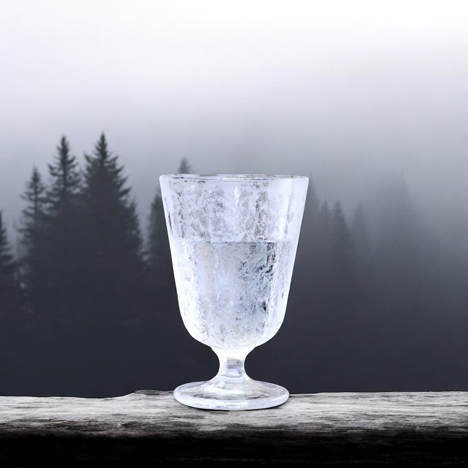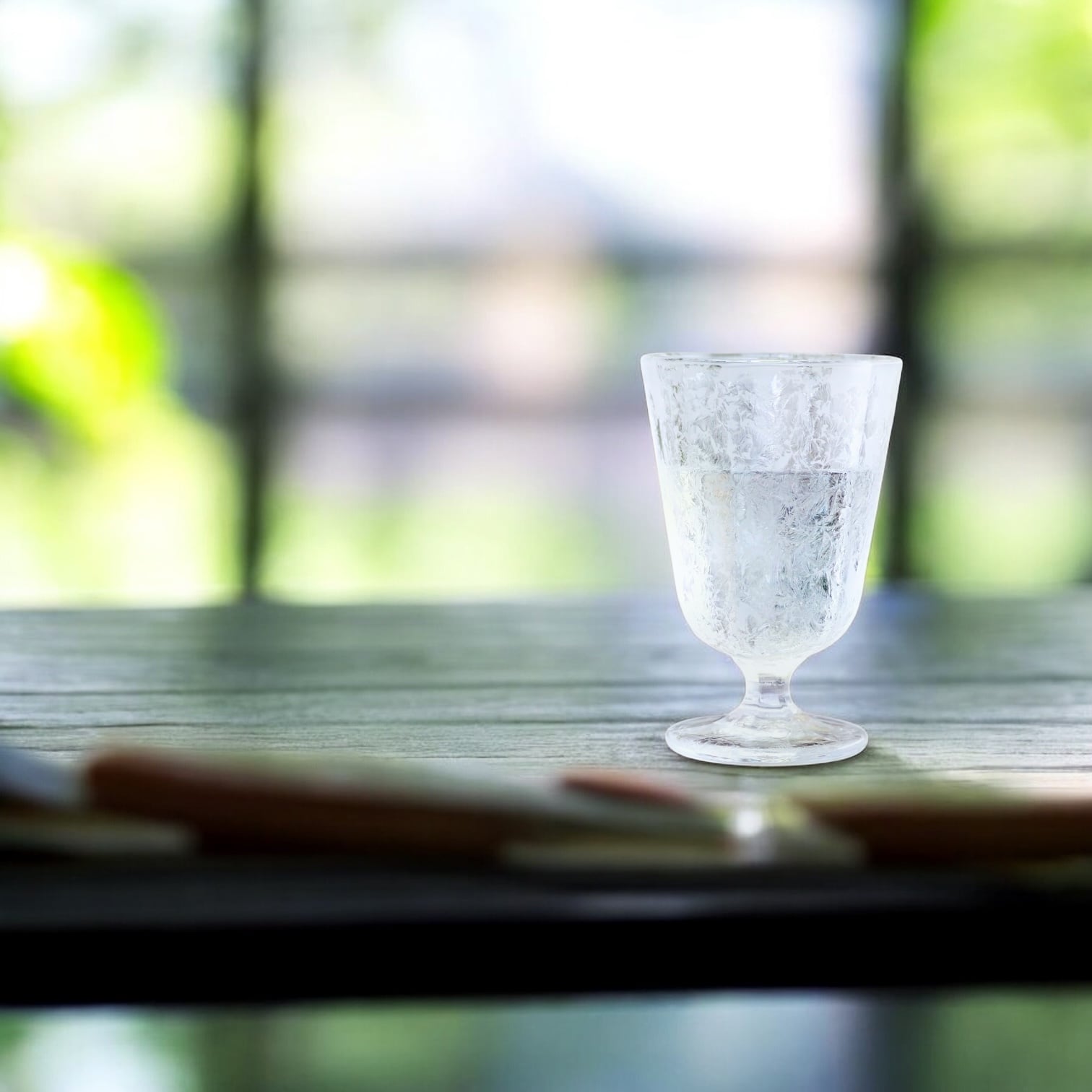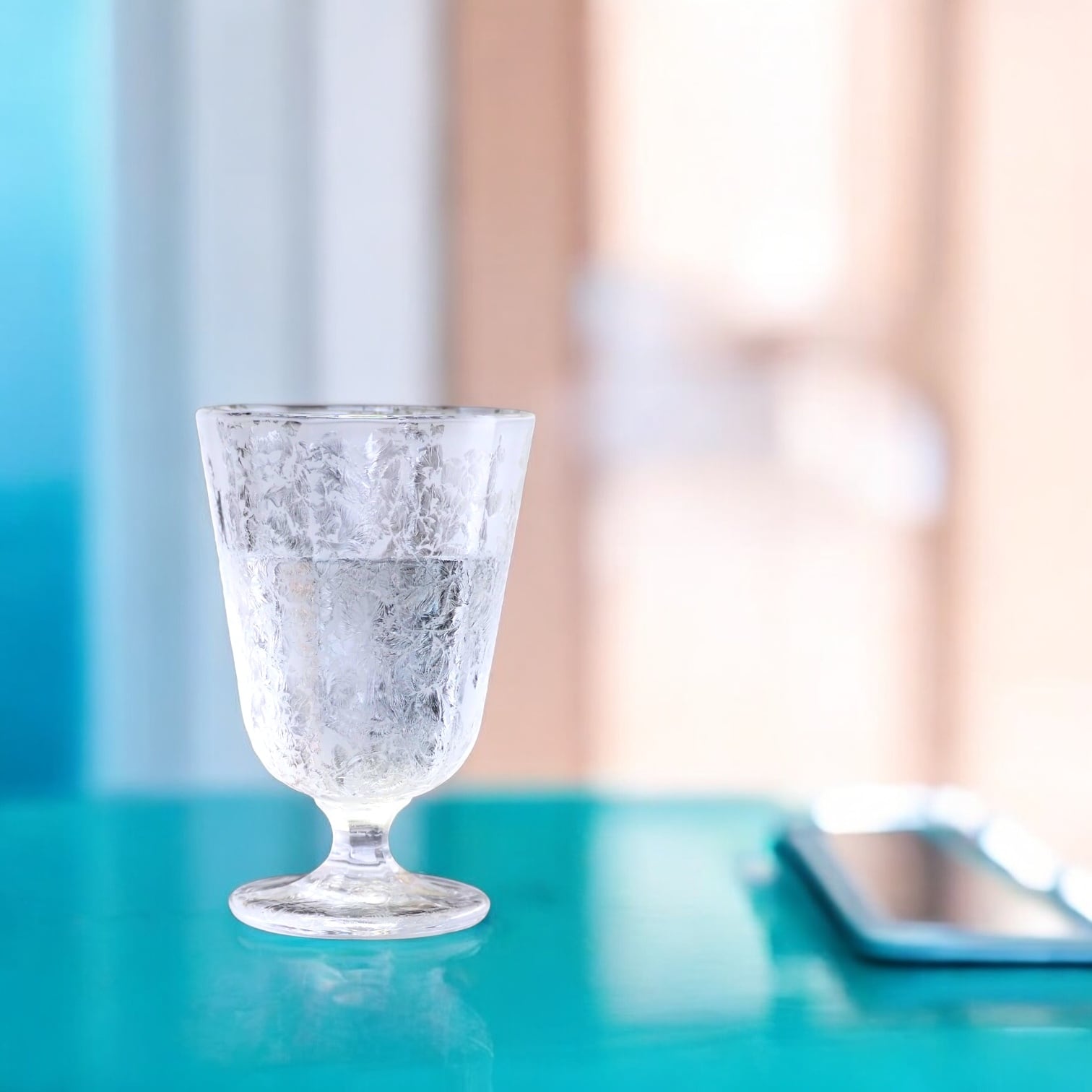 高座のある持ちやすいデザインが特徴のアニバーサリーグラス。180mlの適度な容量は、味わい深く、さまざまな飲み物を楽しむのに最適です。結霜の繊細な模様が施されており、光が当たると美しく揺らめき、まるで特別な瞬間を演出してくれます。めでたい兆しを感じるハレの日の祝杯に、ぜひご使用いただきたい一品です。