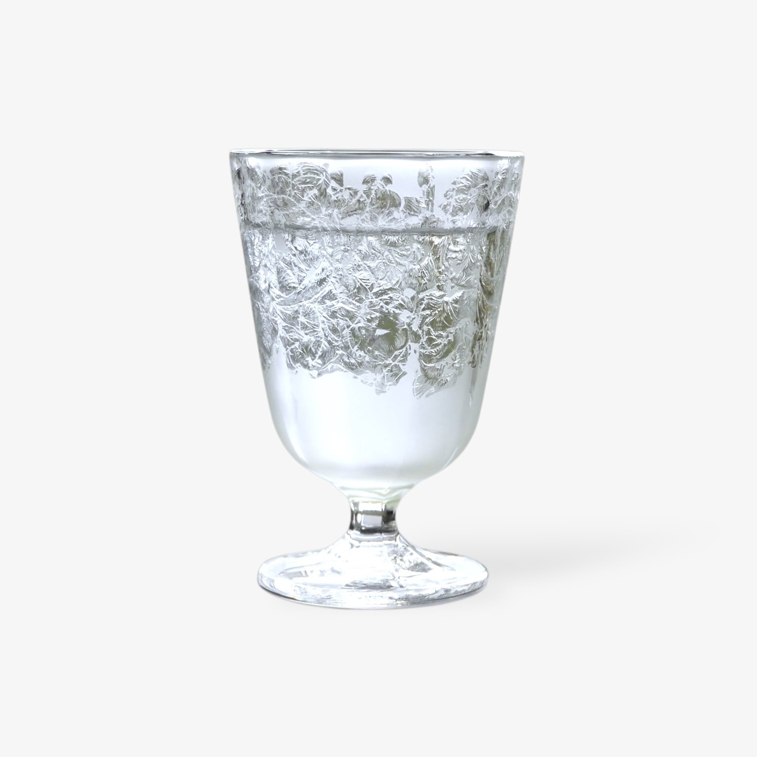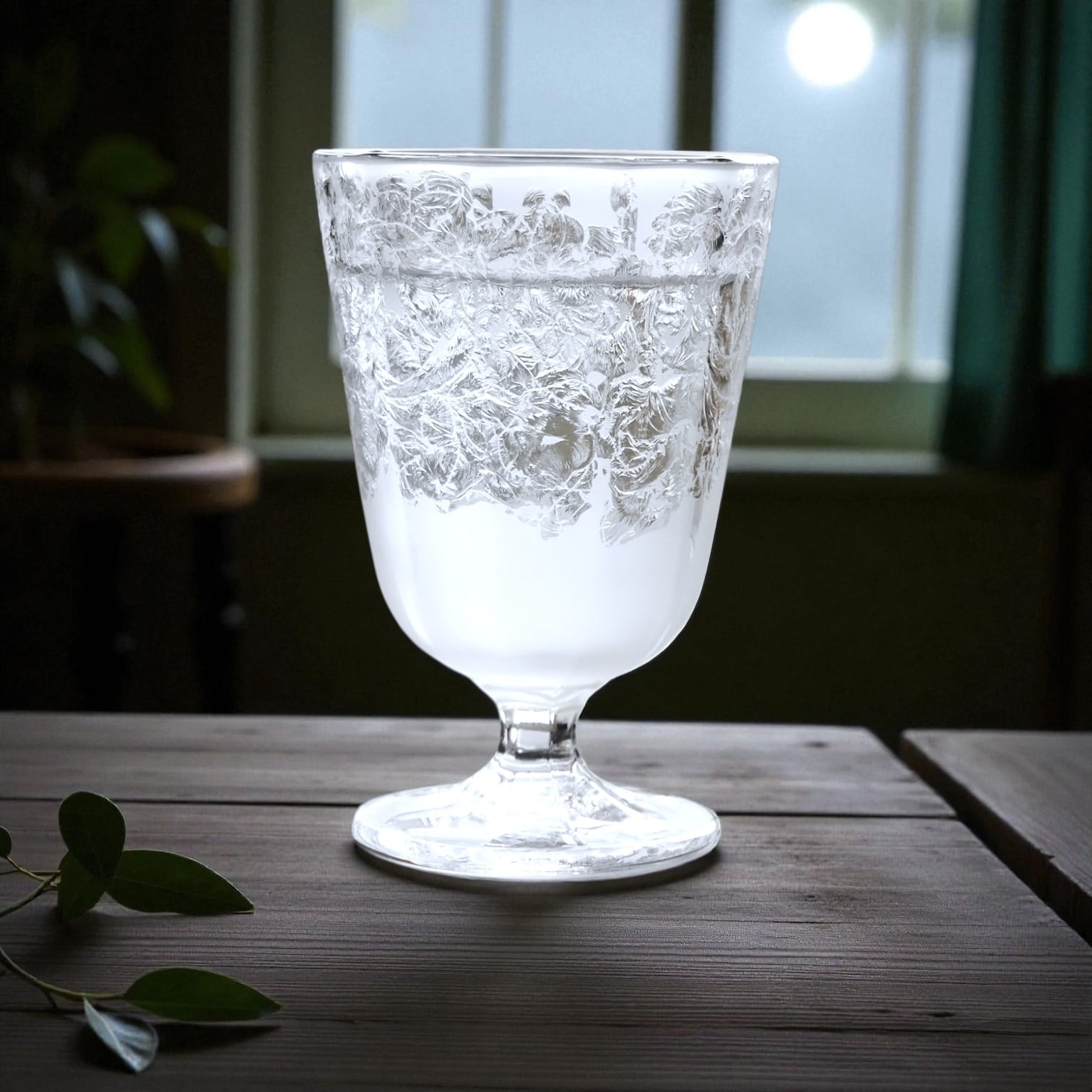 高座のある持ちやすいデザインが特徴のアニバーサリーグラス。180mlの適度な容量は、味わい深く、さまざまな飲み物を楽しむのに最適です。結霜の繊細な模様が施されており、光が当たると美しく揺らめき、まるで特別な瞬間を演出してくれます。めでたい兆しを感じるハレの日の祝杯に、ぜひご使用いただきたい一品です。