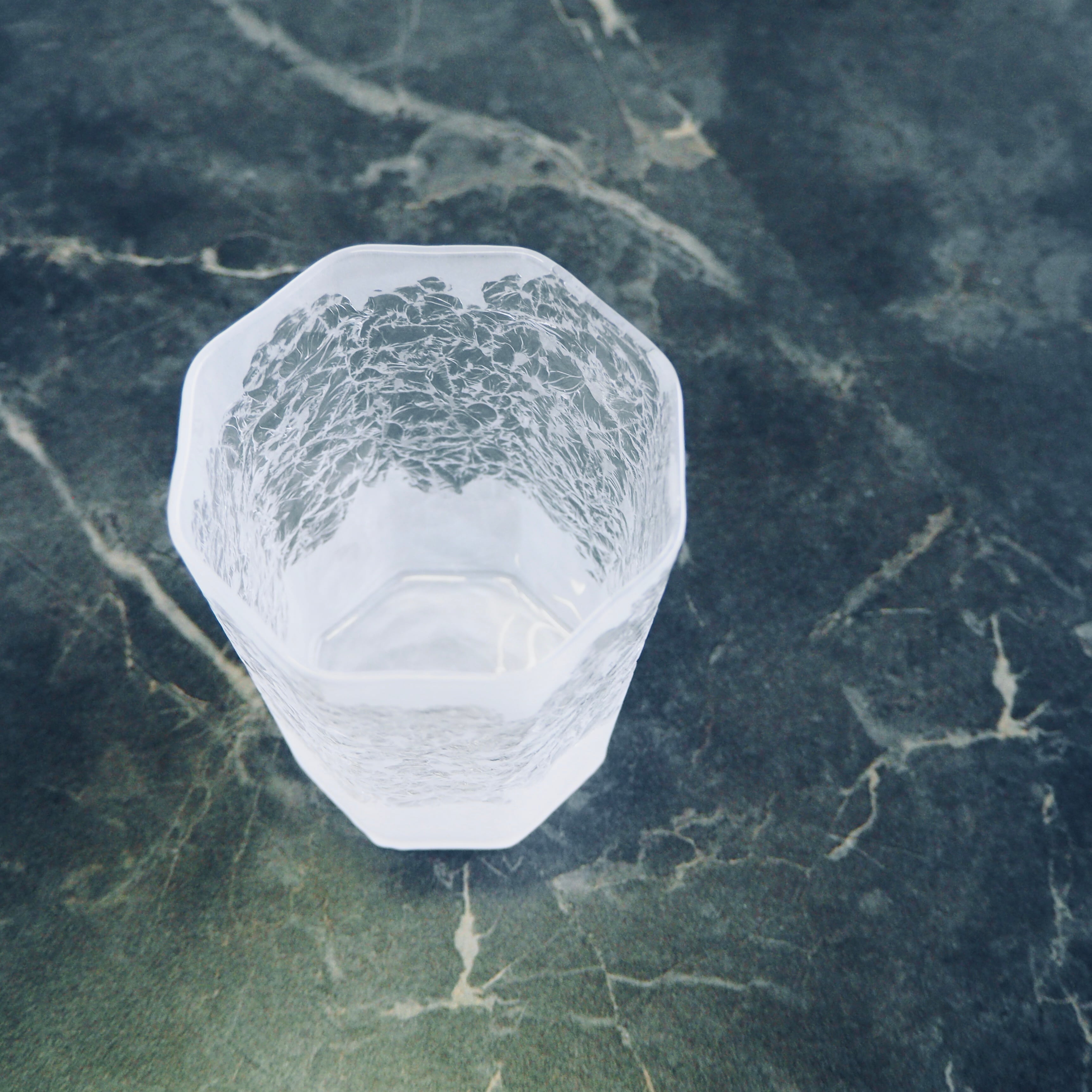 一つは、グラス上部に宿る、ひとつとして同じ模様を描くことができない”霜の華”。人の意図を超えて結ばれる、一期一会の奥ゆかしい美です。